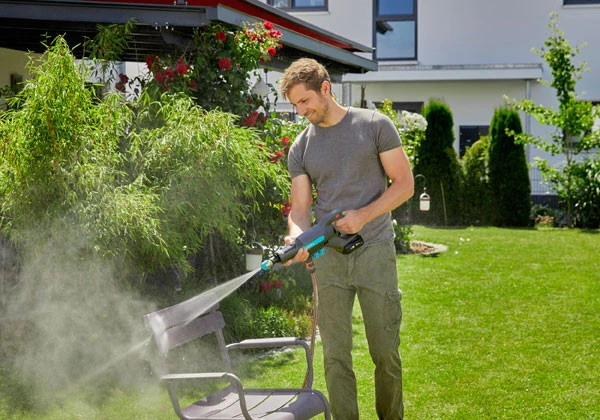 De Gardena Accu Reiniger AquaClean zonder accu is een mobiele, compacte en snoerloze medium drukreiniger en wordt geleverd met diverse accessoires, zodat je direct aan de slag kunt. Een van de meest veelzijdige drukreinigers in zijn klasse met geïntegreerde LED-accustatus weergave in de machine en 3 vermogensstanden voor 9, 14 en 24 bar druk. De drukreiniger kan ongeveer 38, 20 of 16 minuten werken, afhankelijk van de gebruiksmodus. De nieuwe drukreiniger werkt met een nieuw 18V POWER FOR ALL accusysteem. De Gardena Accu Reiniger AquaClean Set bevat drie verschillende spuitmondstukken voor verschillende spuitrichtingen, 0°, 15° of 40°. Elk spuitmondstuk is 360° draaibaar ten opzichte van de lans voor meer flexibiliteit bij het reinigen. De 0° puntsproeier is ideaal voor krachtige reiniging in kleine hoekjes en gaatjes. Een 5 m lange aanzuigslang met filter, vlotter en klem is bij de set inbegrepen. De Gardena Accu Reiniger AquaClean bevat een korte en een lange sproeilans voor nog meer flexibiliteit. Let op de Gardena Accu Reiniger AquaClean wordt geleverd zonder accu en oplader.