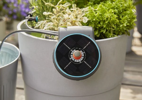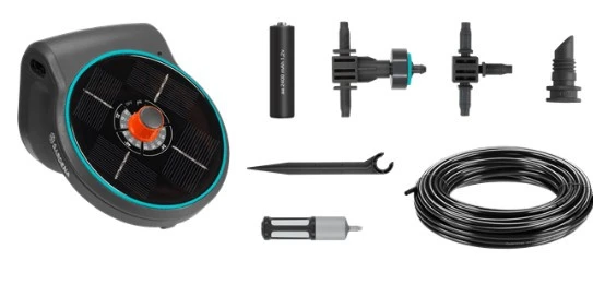 De Gardena AquaBloom Set biedt de ideale irrigatieoplossing voor balkons en terrassen zonder water of elektriciteit. De aquaBloom-set op zonne-energie heeft geen stroom- of wateraansluiting nodig en biedt de planten de optimale hoeveelheid water, ideaal voor het vakantie- en reisseizoen of zelfs het hele seizoen. Dus de planten worden perfect onderhouden, zelfs als niemand thuis is. De Gardena AquaBloom Set heeft alleen een waterreservoir (emmer of bus) nodig voor irrigatie. De Gardena AquaBloom Set werkt op zonne-energie, daarom is een stopcontact niet nodig.