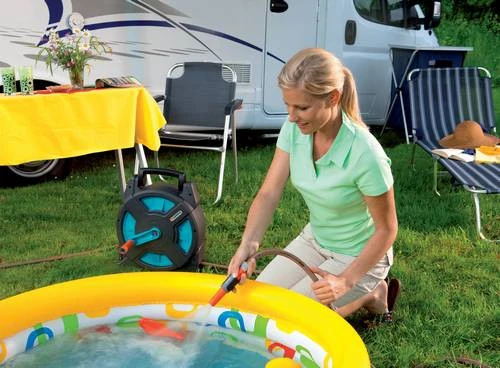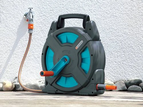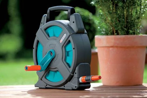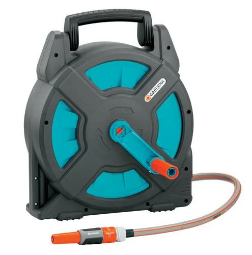 Gardena Classic slangenbox 15 compleet. Ideaal voor gebruik op camping en boot. Licht en plaatsbesparend, met inklapbare handzwengel, draaggreep en cassette. Weefselslang (diameter 11 mm). Compleet met Original Gardena System onderdelen en tuinspuit. Klaar voor gebruik – gewoon benodigde slanglengte afrollen.