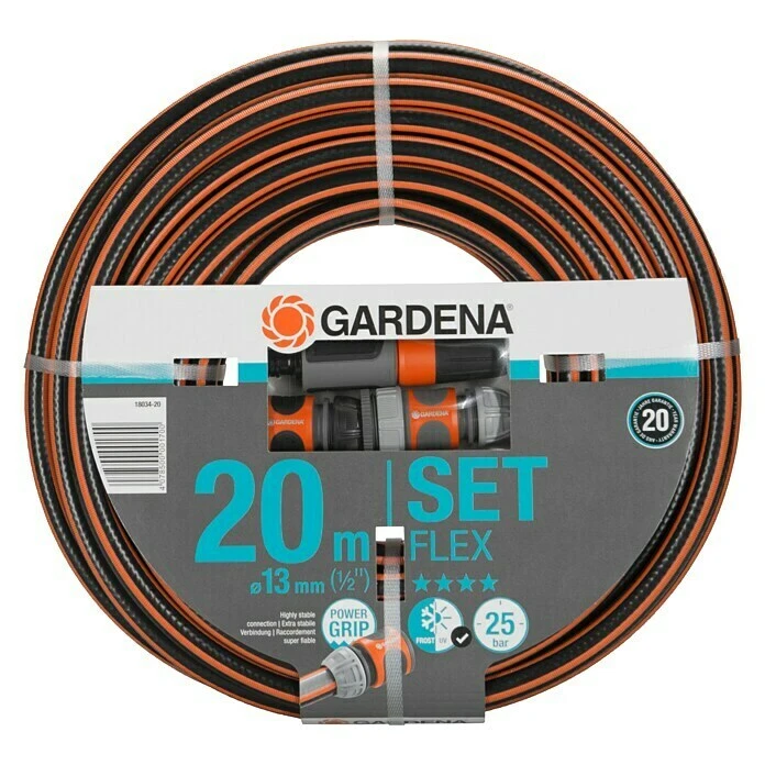 De Gardena slangenset Flex bestaat uit een slang van 20 m, een kraanstuk, een adapter, een waterstop, een sproeier en een slangstuk. Deze praktische set is voor elke goed geoutilleerde hobbytuinier onmisbaar voor het besproeien van planten in de tuin en op het terras. De fabrikant geeft 20 jaar garantie op deze slangenset.