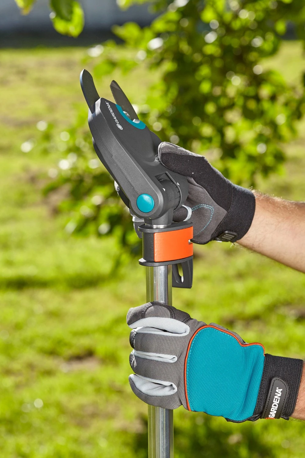 De GARDENA boom- en takkenschaar StarCut 160 plus is de specialist voor boomonderhoud. Met een lengte van 160 cm is eenvoudig en veilig zagen van de grond zonder ladder mogelijk. De 12-voudige transmissie zorgt voor krachtig zagen van takken met een diameter tot 32 mm. De nieuwe, verstelbare haak voor het verwijderen van afgezaagde takken biedt extra comfort. Hiermee kunt u gezaagde takken zonder problemen van de kronen van bomen verwijderen. De GARDENA StarCut 160 plus heeft een intern katroltransmissiemechanisme dat voorkomt dat het tijdens het snoien in takken blijft haken. De extra lichte en slanke snijkop maakt handig en gericht snoeien zelfs bij de stam mogelijk. De snijhoek kan individueel vanaf de grond worden aangepast. De precisiegeslepen, niet-klevende messen verminderen de weerstand bij het zagen en garanderen een eenvoudige reiniging. De trekhuls met slipstop en een extra T-hendel zorgen voor een aangename en veilige bediening en nog meer bereik. Dit bereik bedraagt